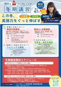 京成津田沼校では12月1日(月)~1月24日(土)までの期間(12月31日~1月3日を除く)に冬期講習を行います。