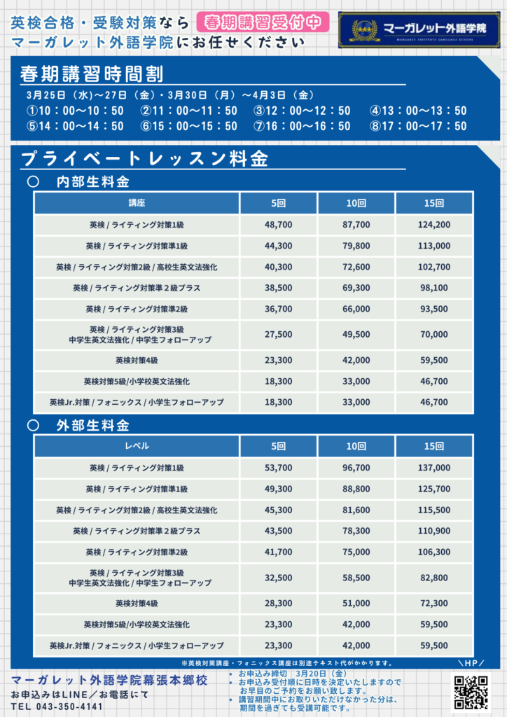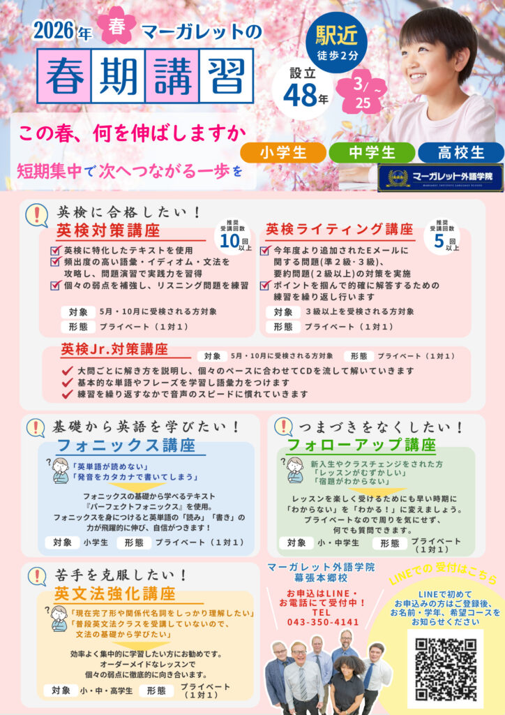 講座:①英検対策講座 ②英検ライティング講座 ③英検Ir.対策講座 ④英文法強化講座 ⑤フォニックス講座