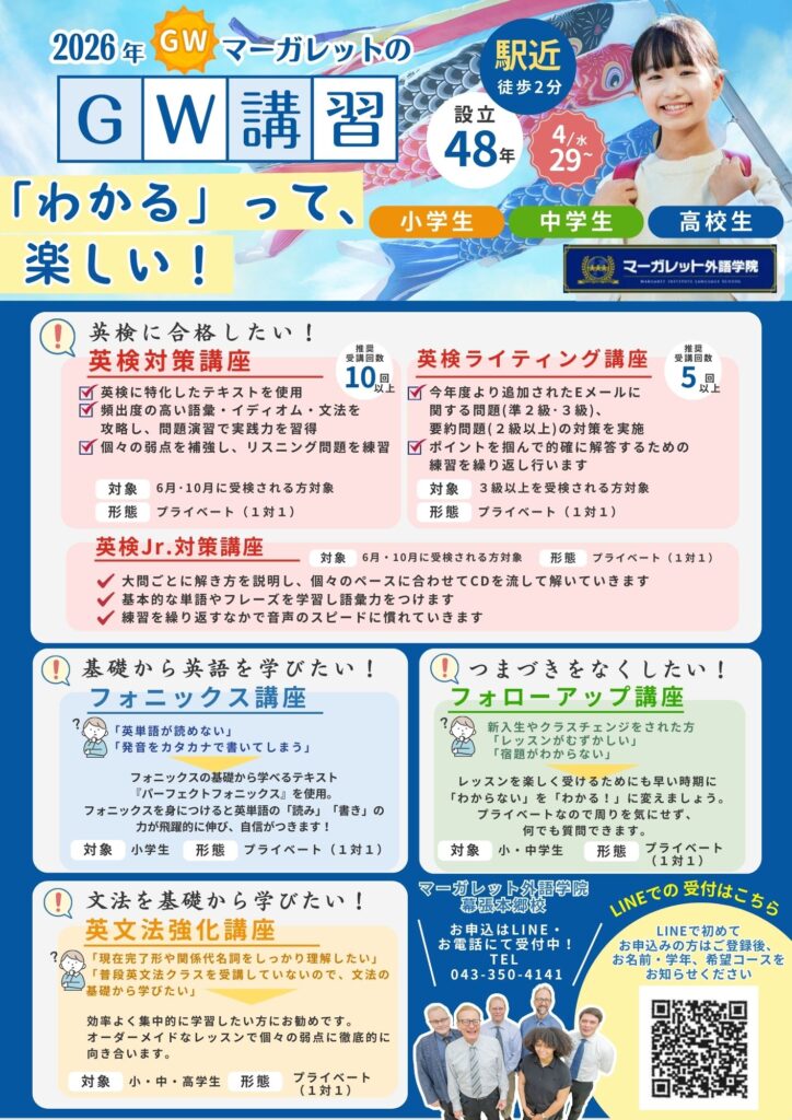幕張本郷校では2026年度第1回英語検定試験(5/31 日曜日実施)を控えている皆様に向けてGW期間に