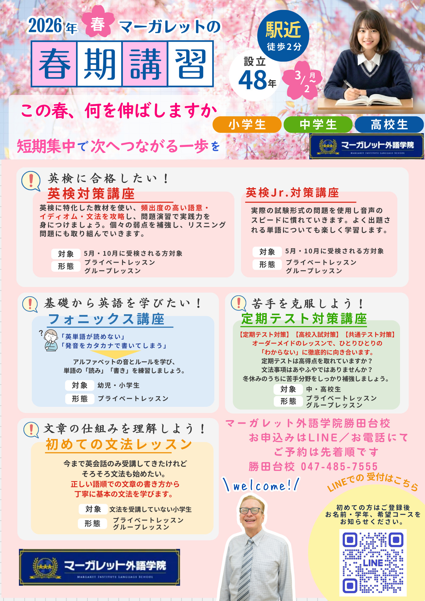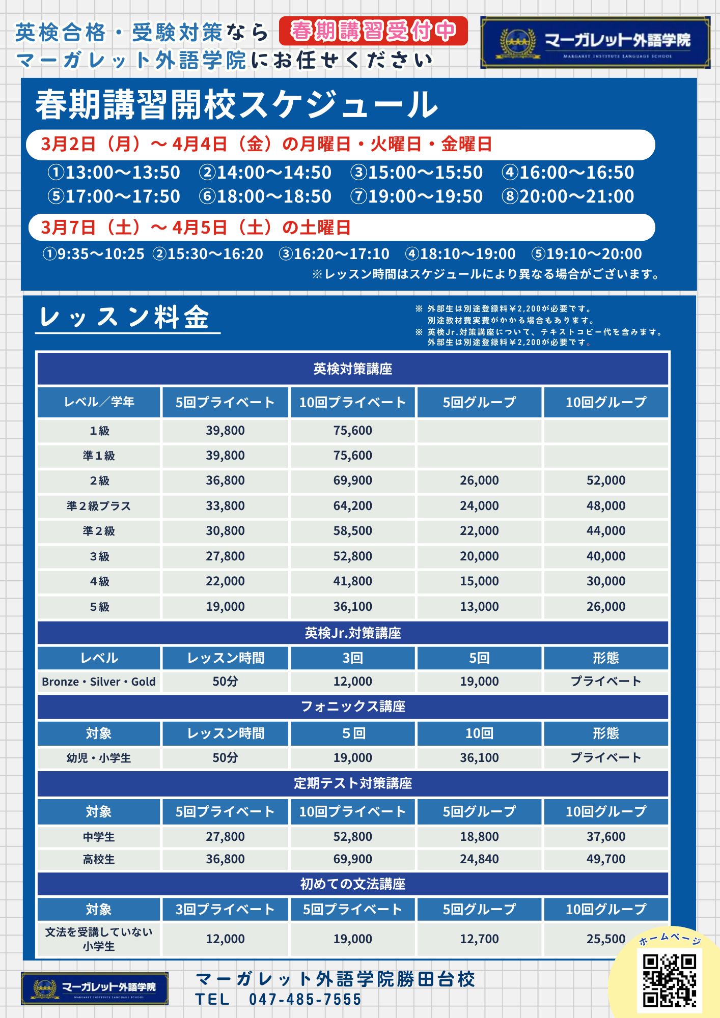 マーガレット外語学院では、3月2日~4月5日の期間、春期講習を開講します。